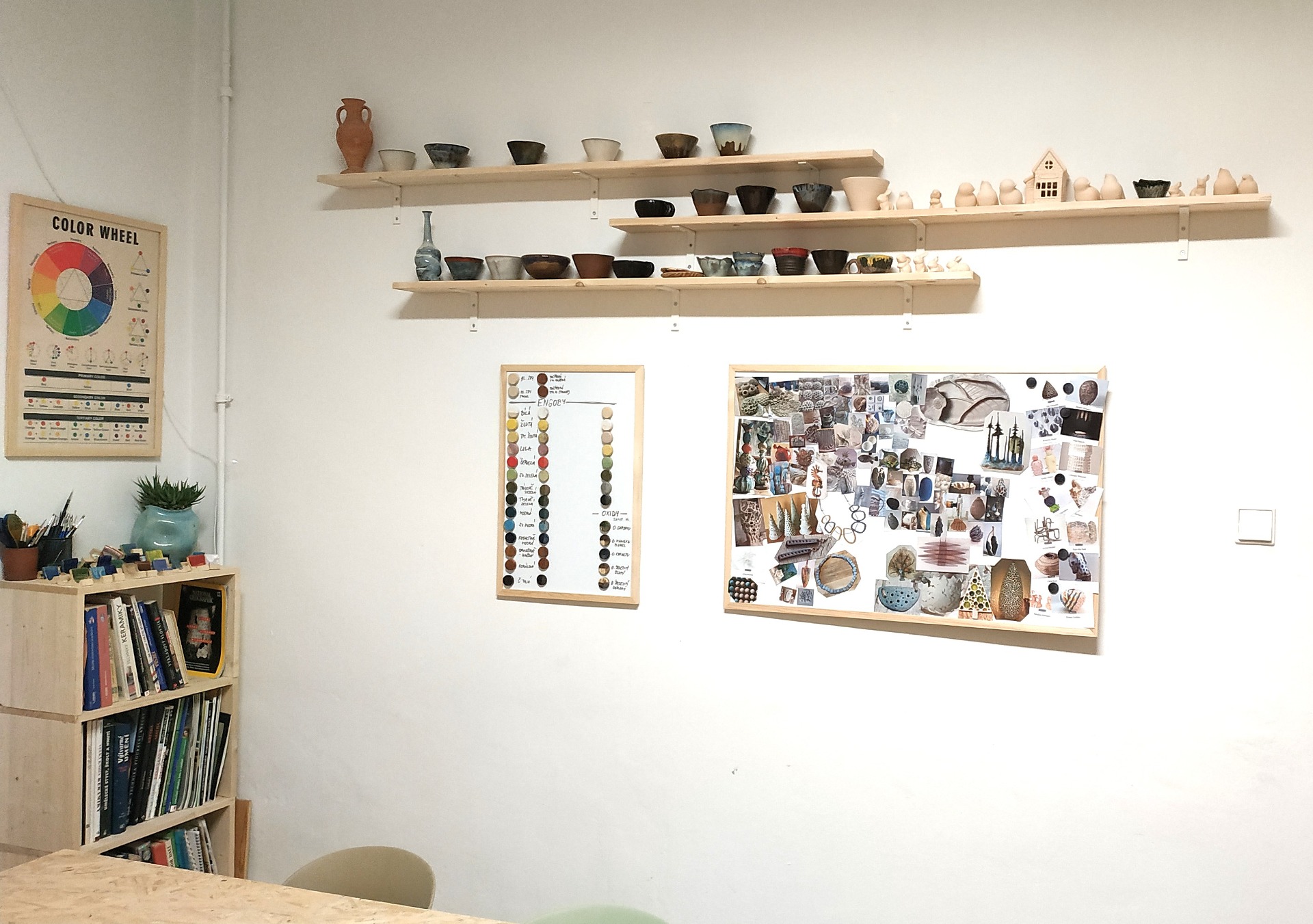 Pokud byste zrovna neměli jasnou představu a nevěděli, co si vytvořit, můžete se nechat inspirovat přímo v ateliéru. K dispozici je knihovna i nástěnka s ukázkami tvorby keramických autorů, maleb, kreseb a grafiky, které mohou sloužit jako volný inspirační zdroj. Součástí prostoru je také vzorník engob a glazur.